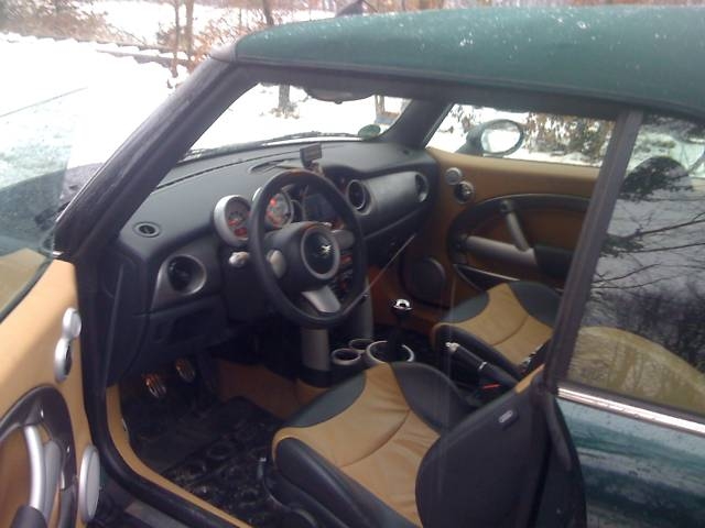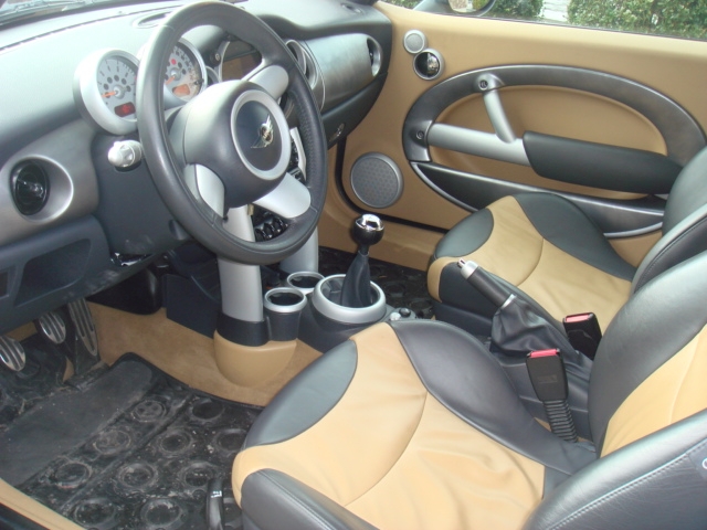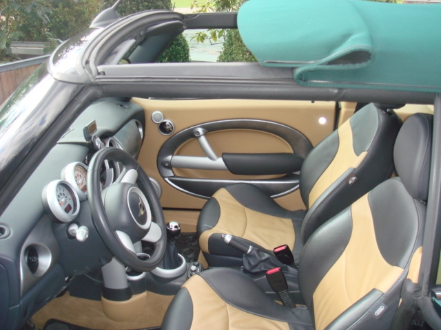 Airbag Airbag passagier Airco Centrale vergrendeling Electrische ruiten Laterale airbags Leder bekleding Lichtmetalen velgen Navigatiesysteem Open dak Parkeersensor Stuurbekrachtiging Xenon lichten ABS Alarm Automatische tractie controle Boordcomputer CD Cruise control ESP Mistlampen Radio/cassette Startonderbreker Zetelverwarming Mini Cooper S cabriolet Megafulloption